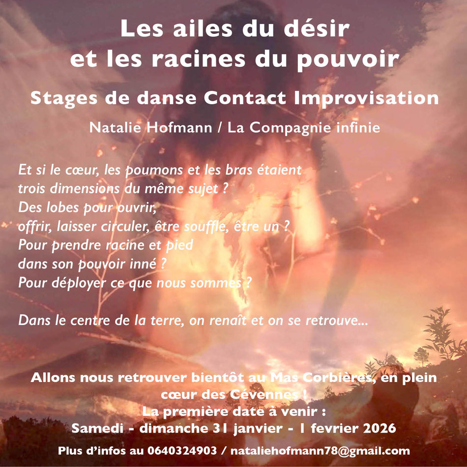 Le temps d’un week-end, nous allons déployer nos ailes, découvrir nos désirs profonds, renforcer la puissance de nos racines et cultiver notre pouvoir inné. La pratique du Contact Improvisation qui est un mélange de danse, de sport et de jeu est ici située dans une démarche qui dépasse le corps physique et agit sur l’être entier que nous sommes, et ce dans un contexte de relation et de collectif. L’exploration de la voix et différentes pratiques associées telles que la Release-Technique, le Mouvement Authentique , la pratique somatique et la composition instantanée soutiendront le voyage.